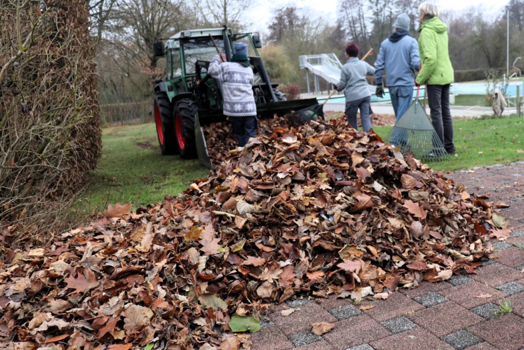 20 Helfer machten sich beim 2. Herbstarbeitseinsatz an die die scheinbar unlösbare Aufgabe das Sommerbad vom Laub zu befreien. Was im Sommer den Charme des Freibades mit einer tollen grünen Kulisse ausmacht, wird im Herbst zum Problem. Laub, Laub und nochmals Laub auf der großen Liegewiese, den Spielplätzen und der Allee und Laufstrecke für „swim and run“. Gut war es da, dass neben Muskelkraft für Harken und Forken auch maschinelle Hilfe gab. Gleich vier Traktoren, Muldenkipper und Laubgebläse waren im Einsatz.